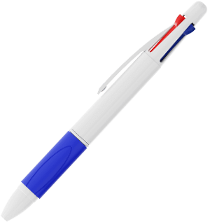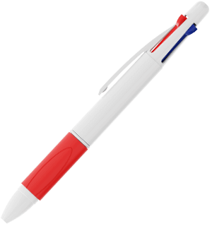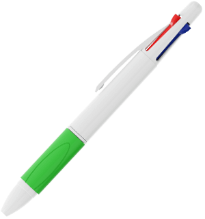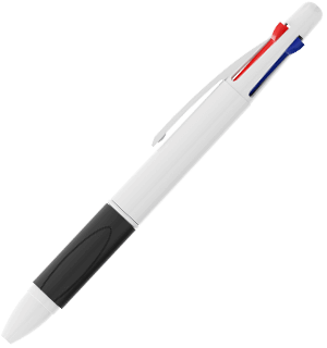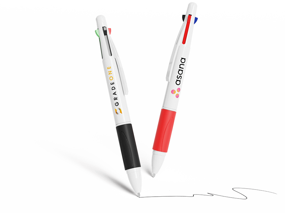 A Quad é uma caneta clássica de 4 cores que possui esferográficas azuis, vermelhas, verdes e pretas no modelo 1. Cada opção de cor revela-se e retrai-se através dos controlos deslizantes de clique na parte superior da caneta. A confortável pega de borracha termoplástica está disponível numa variedade de cores para complementar o estilo da sua marca. A parte exterior branca pode ser Impressa com Foto do seu logótipo, slogan e muito mais.