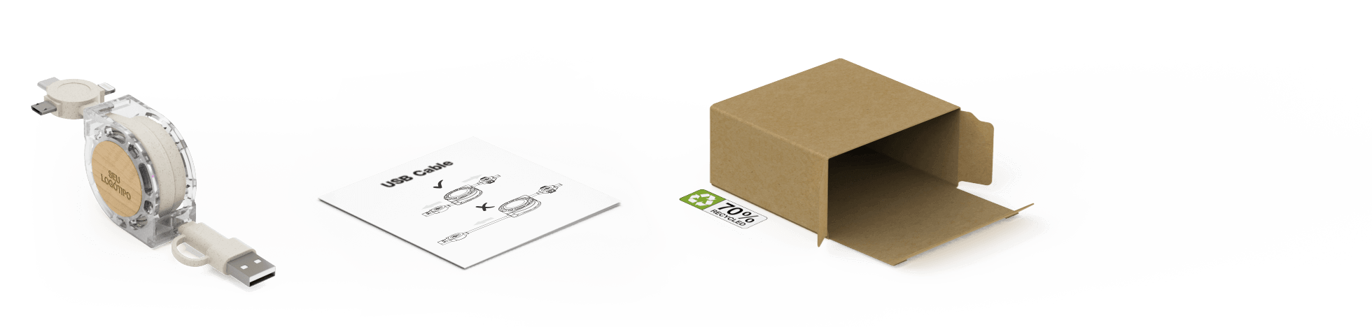 O cabo é fabricado a partir de bio-plástico de palha de trigo, oferecendo uma solução ecológica que se alinha com as práticas sustentáveis da sua marca. A área de impressão é feita de madeira certificada pelo FSC para continuar o tema da sustentabilidade. Preencha um Cotação rápida hoje para receber uma lista de preços personalizada e começar a personalizar os seus hubs Motion Wood!