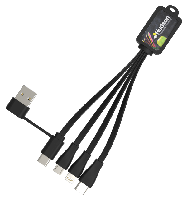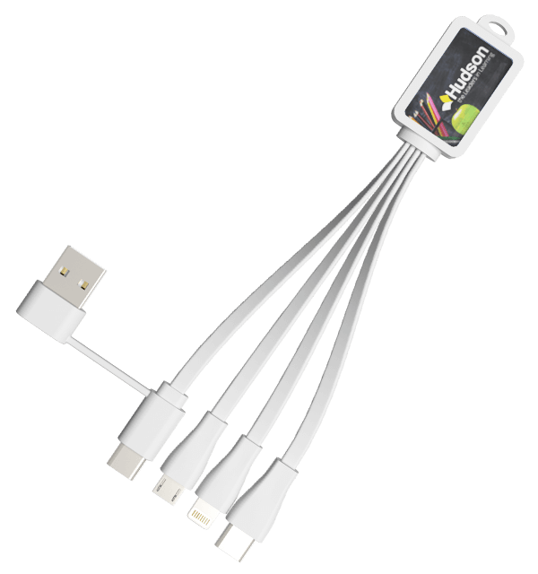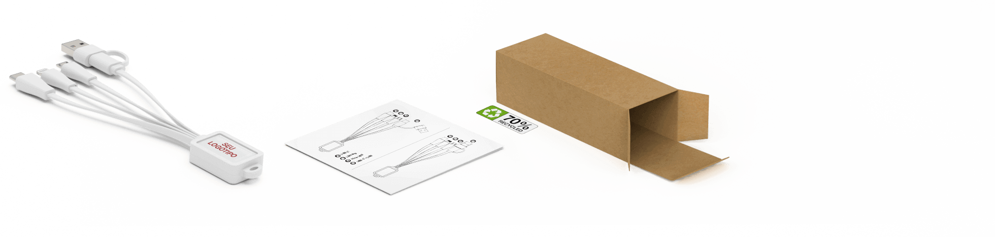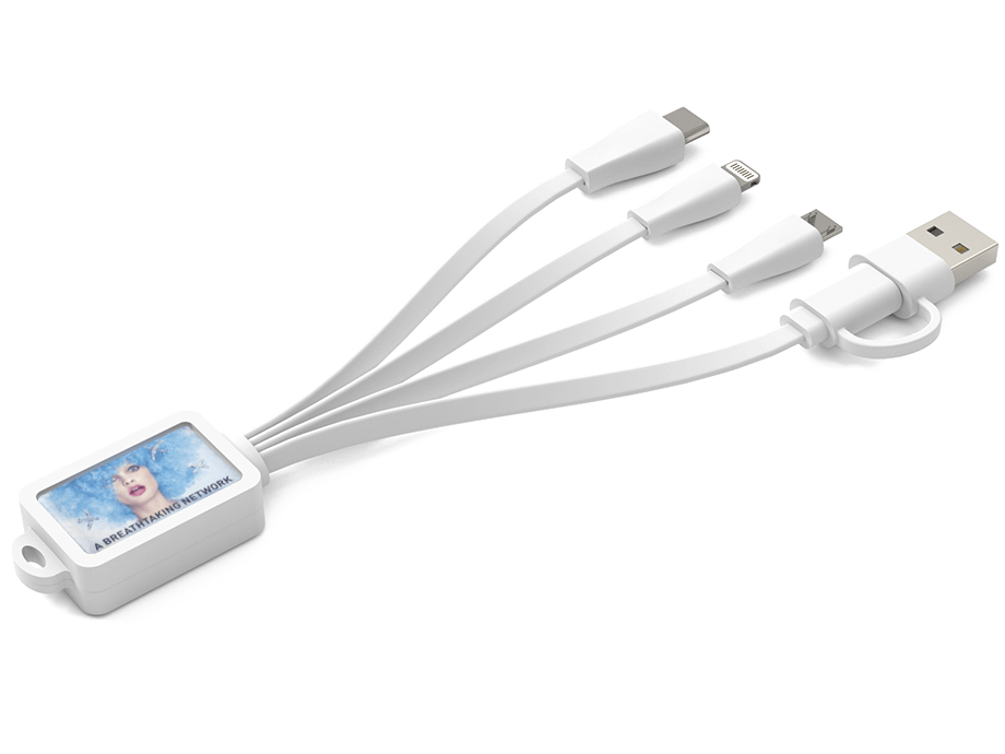 O modelo Multi combina 4 cabos num elegante e útil modelo. Os seus Clientes poderão conectar o conector USB standard a uma fonte de energia e carregar até 3 dispositivos em simultâneo com o adaptador Lightning, conector USB-C e conector Micro-USB. O Multi pode ser acoplado a um conjunto de chaves e dispõe de uma bonita área de impressão a ser personalizada com Impressão Fotográfica com a sua imagem, logo, website e slogan. Para um toque de madeira, veja o nosso modelo .