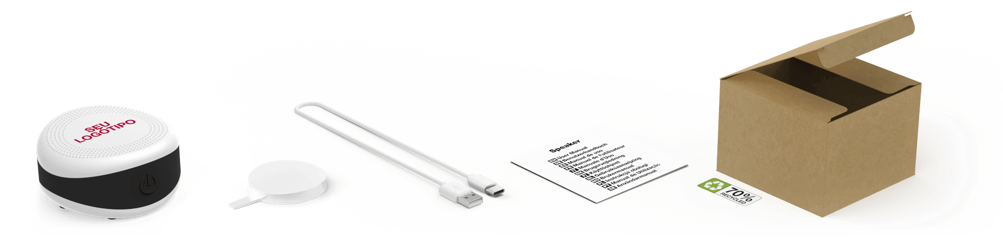 O termo Bluetooth® é o que os utilizadores visualizam no seu smartphone ou tablet quando emparelharem com o seu dispositivo Áudio. Podemos personalizar com o nome da sua marca, dando à sua empresa mais visibilidade. Se não pretender este serviço, o nome por defeito do dispositivo Áudio será 'Promo Audio'.Peso e dimensões