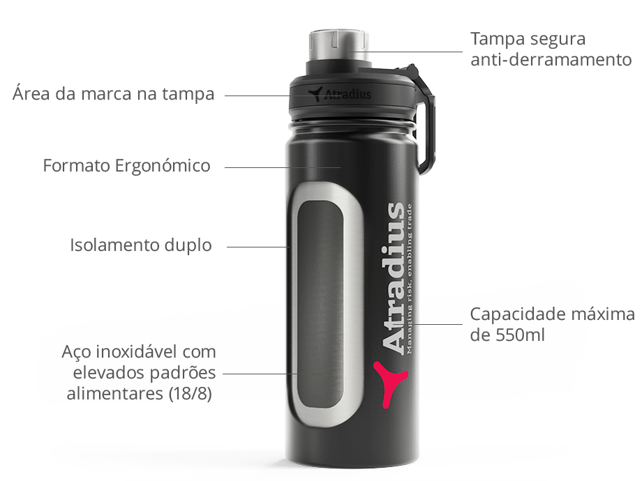 Existem cinco opções de marca para a garrafa Adventure, para que possamos apresentar o design escolhido exatamente como imaginou.