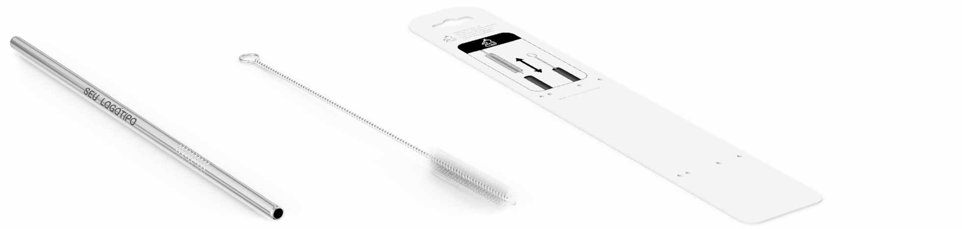 A palhinha metálica reutilizável Straight dispõe de uma área de personalização reservada a ser Gravada a Laser com o seu logo em preciso detalhe. Cada palhinha é enviada de forma segura presa a um cartão para fácil distribuição na sua próxima Conferência ou Evento, e também inclui um acessório para lavar a palhinha.